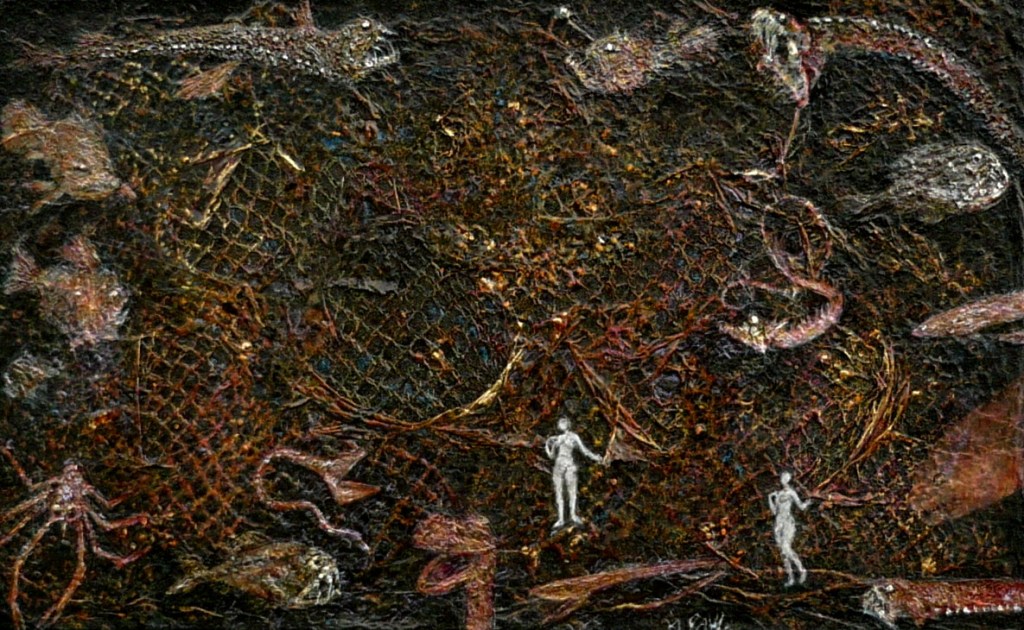 Nereids Reach the Deep Sea Floor started with an impulse to play – with pigment, mediums, collage – with paint. Over time and iterations I came to understand at last where it was going and brought in the Nereids and their friends: the luminescent, fanged creatures of the dark mountainous world that is the bottom of the ocean. Monstrous in appearance to us, it is they who are under threat, endangered because of the commercial fishery practice of bottom trawling. (Present here: Dragonfish (x2), anomuran, coelacanth, hatchet fish, fangtooth (x2), anglerfish, viperfish (x2), predatory tunicate, frilled shark, gulper eel (x2), tube-eye.)